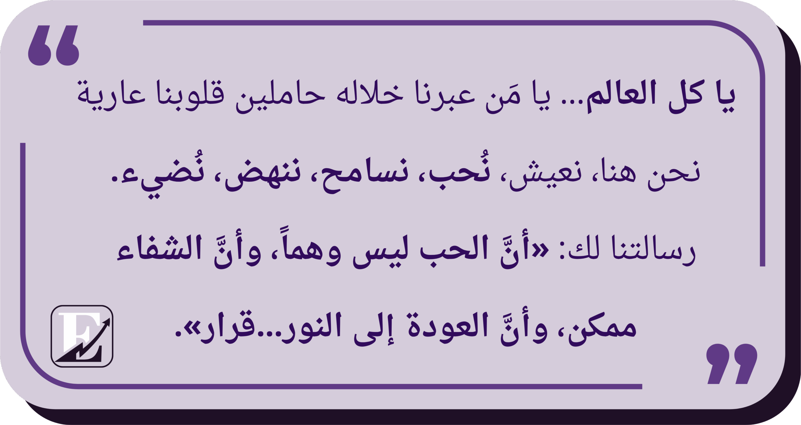 لم تكُن الرحلة عبثاً، ولا الجُرح لعنة. كل ندبة كانت طريقاً، وكل دمعة بذرة لنور. ها نحن نُسلّمك الشعلة، لا كعبءٍ من الألم، بل كإرثٍ من المحبة والوعي. «أنَّ ما بدأ بالصمت والخِذلان، ينتهي بالحياة التي تُزهر حُباً».